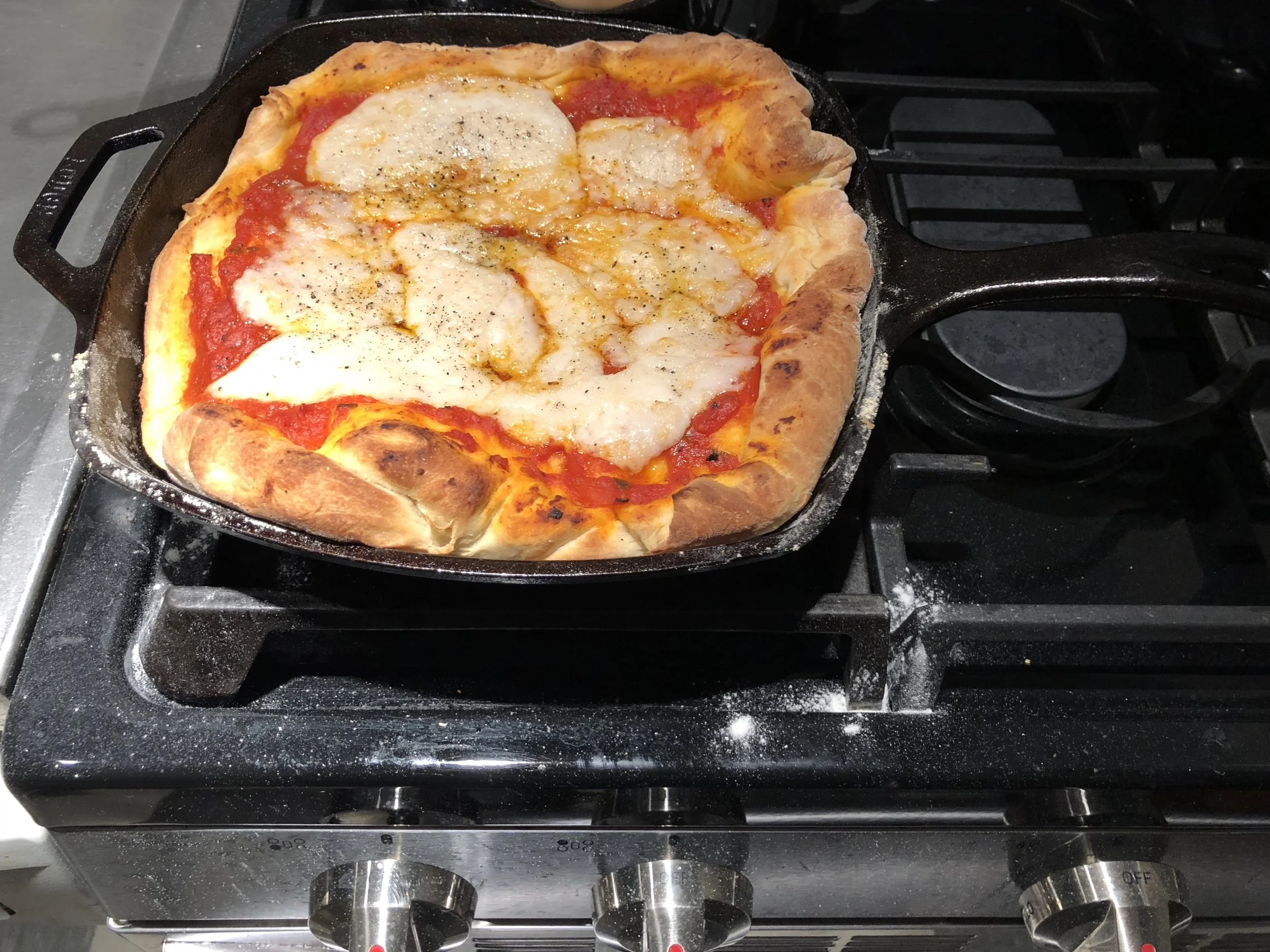 For the pizza, I baked it in a cast iron skillet. Preheat your oven to 500 degrees. Warm the skillet in there for about 10 minutes. Remove, press down the dough (don’t burn your precious fingers!), & add the toppings.